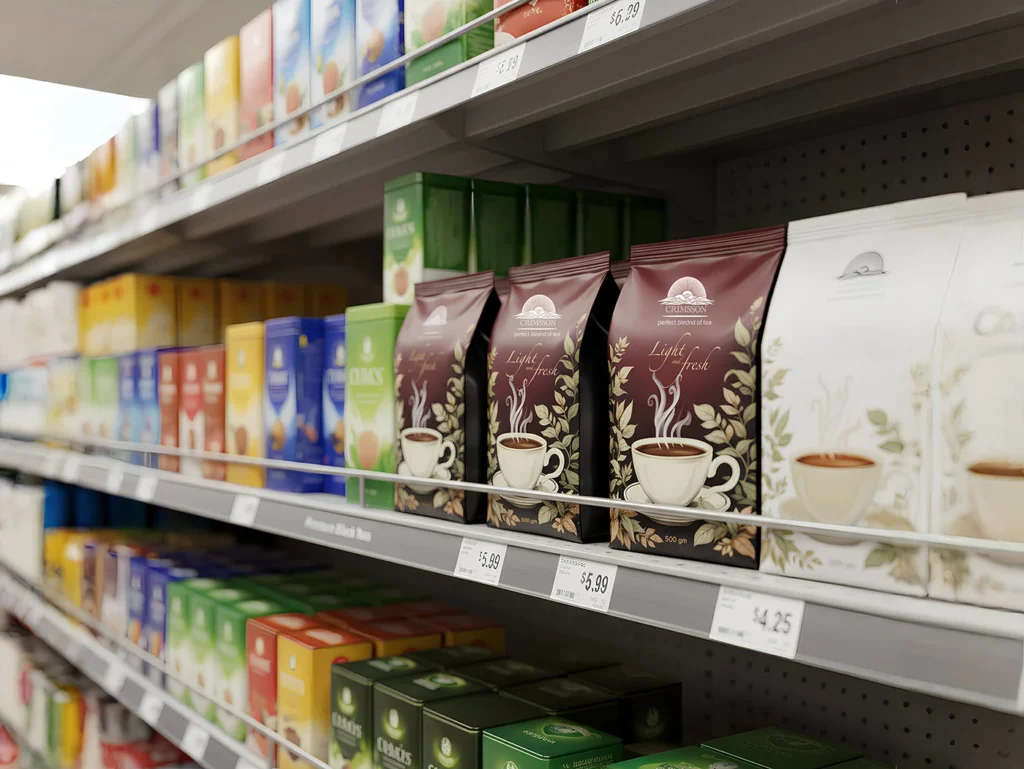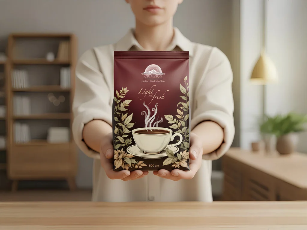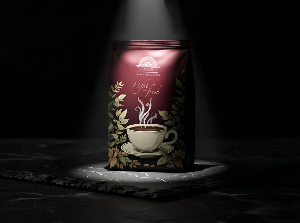 Subtle Brand Messaging: The unique phrase “perfect bleeding of tea” is prominently featured, creating intrigue and signaling a high-quality, full-flavored blend.