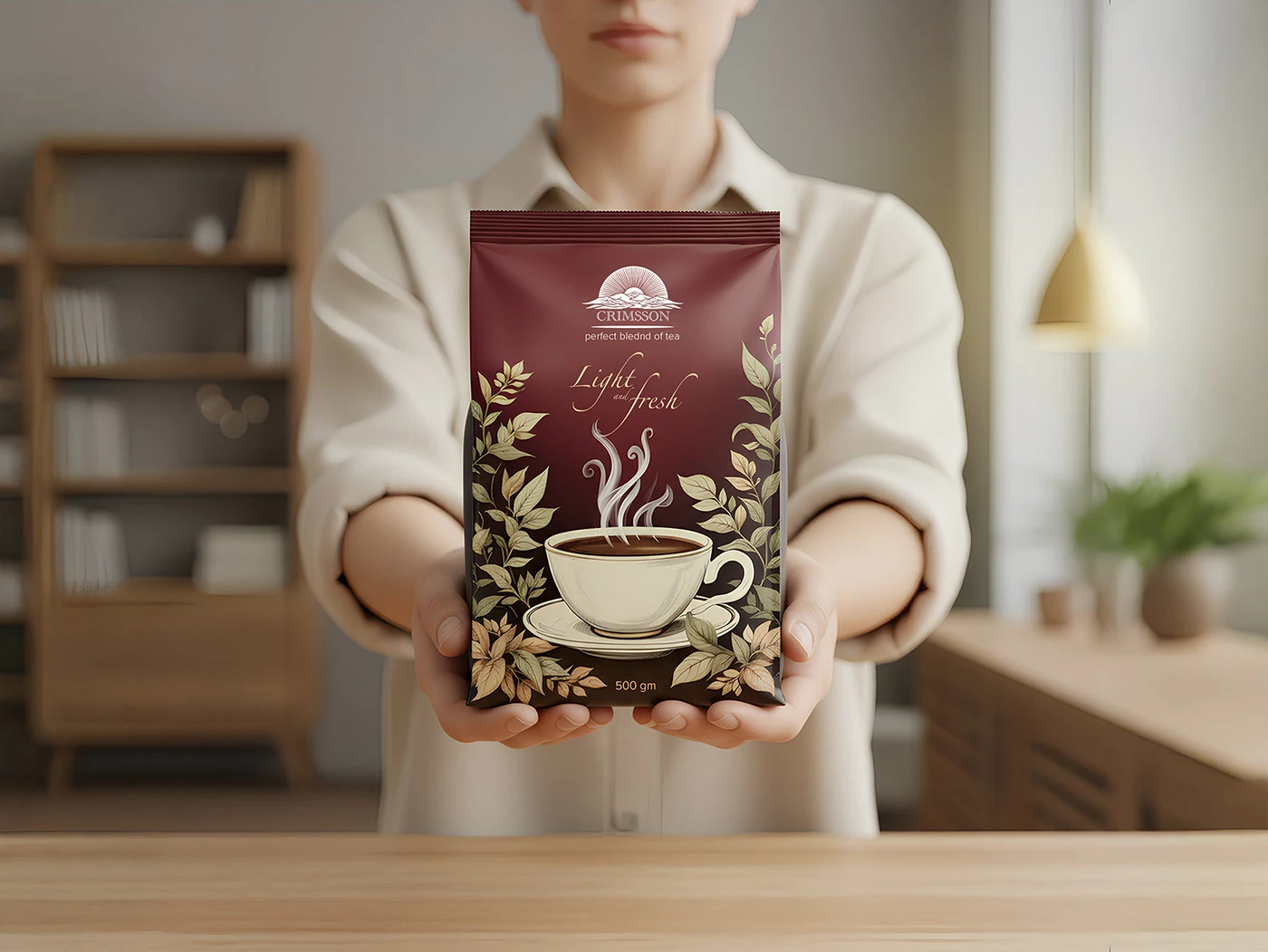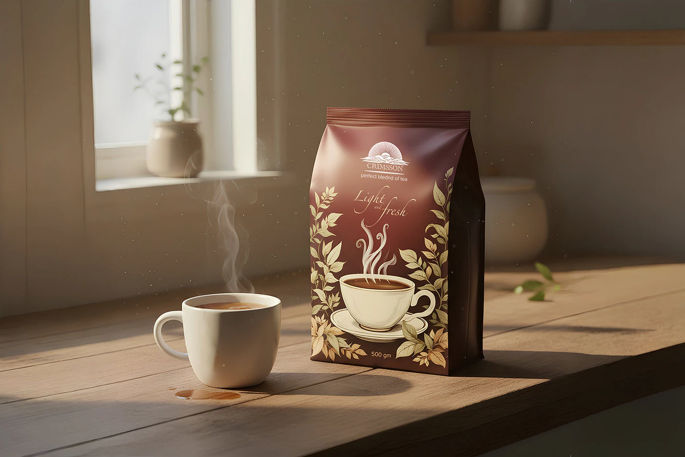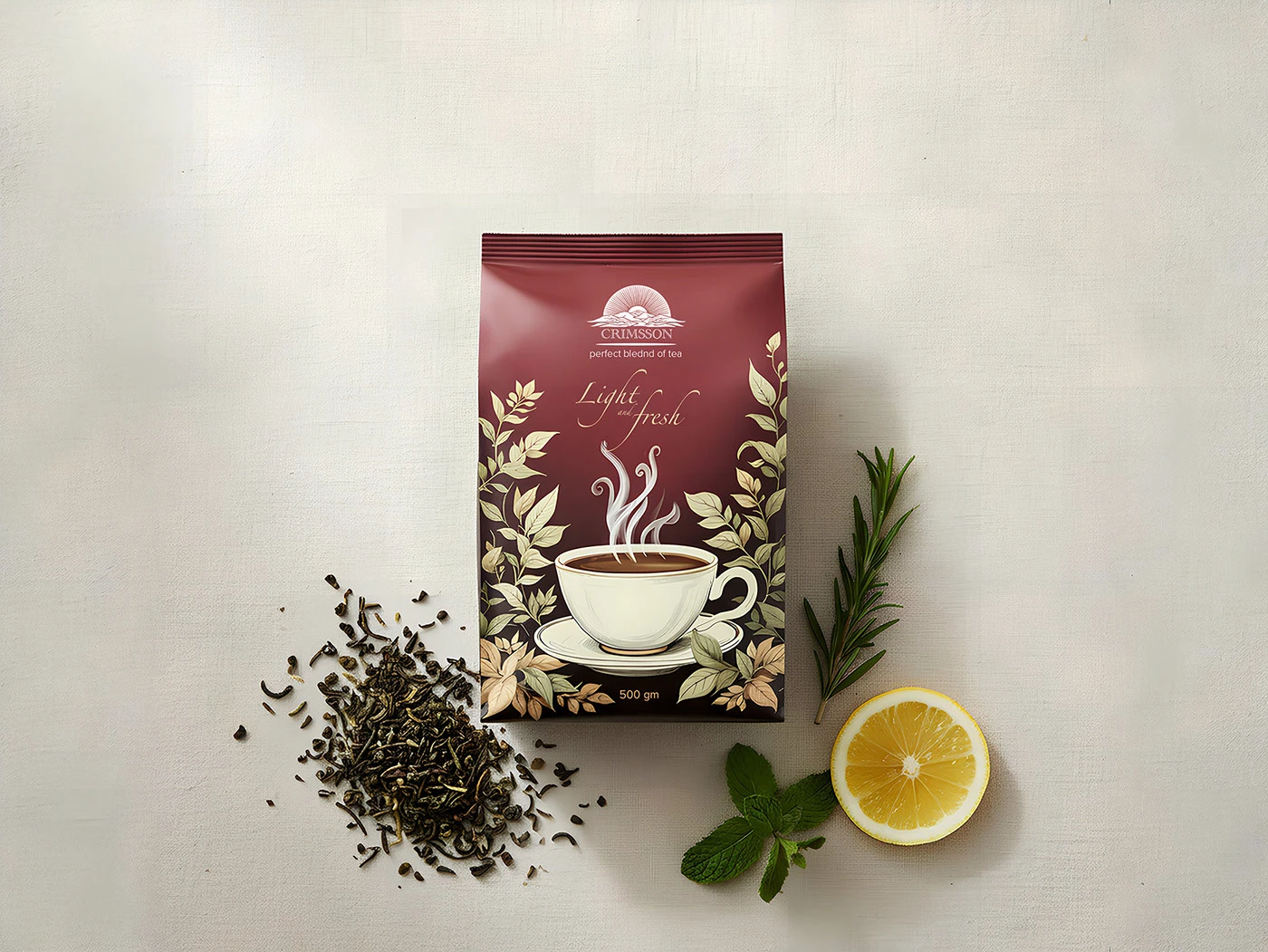 A sleek, minimalist packaging design for CRIMSSON Tea, embodying the brand’s promise of a “perfect bleeding of tea” for a “light” and “fresh” experience.